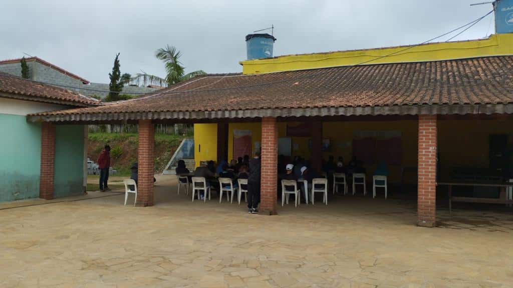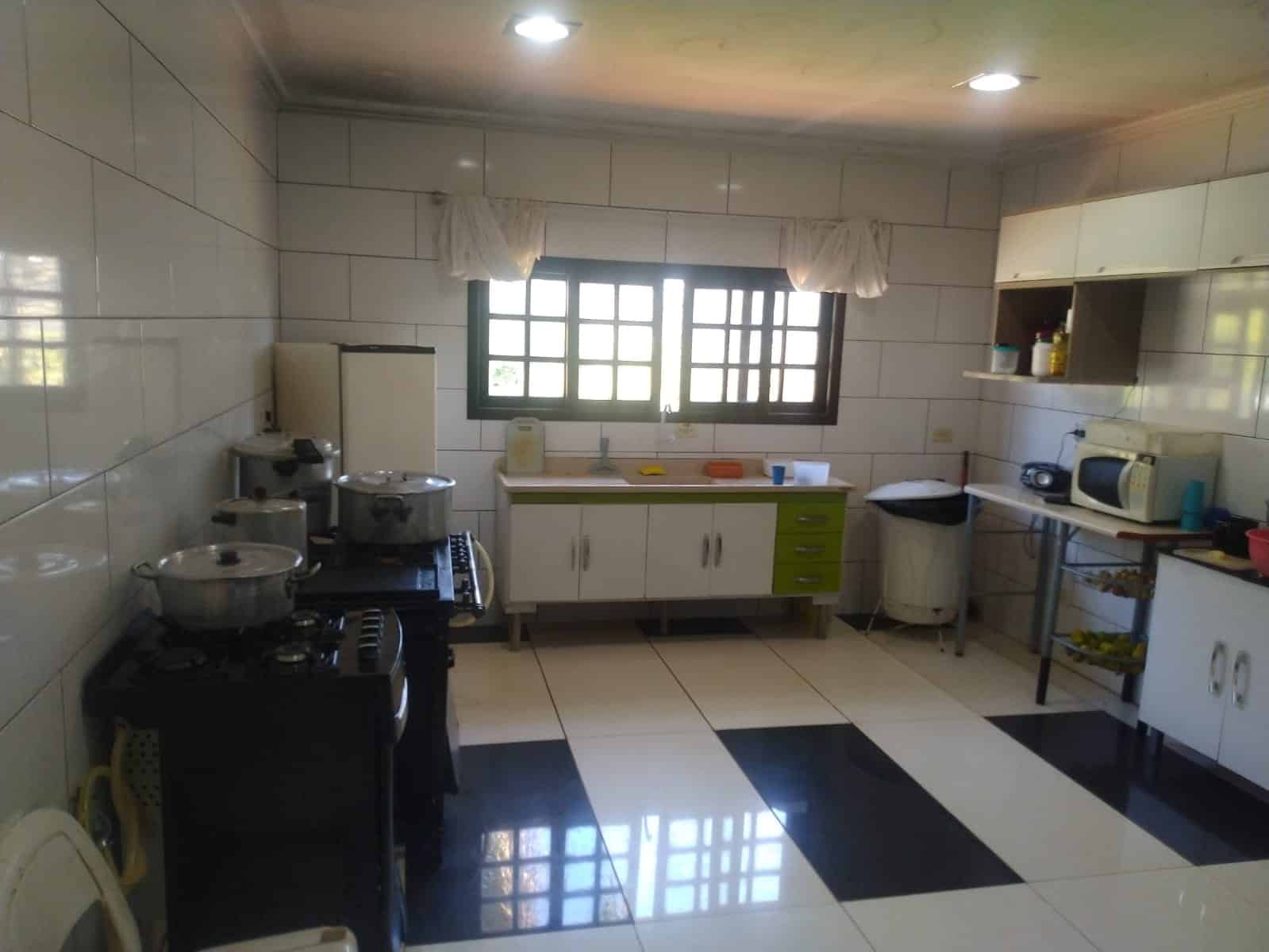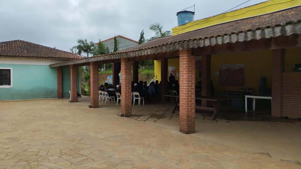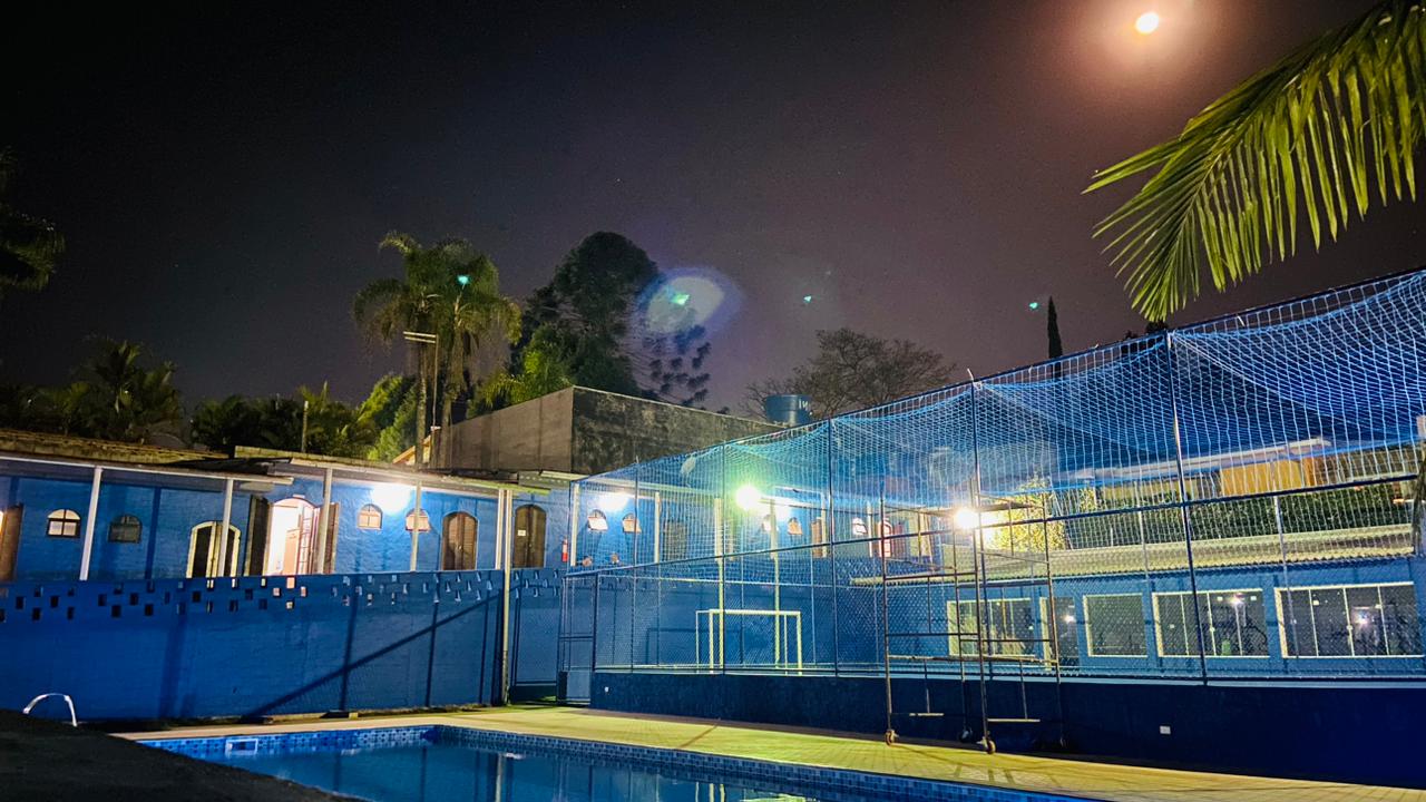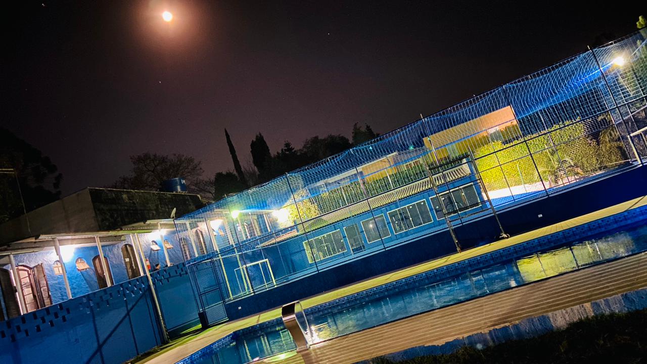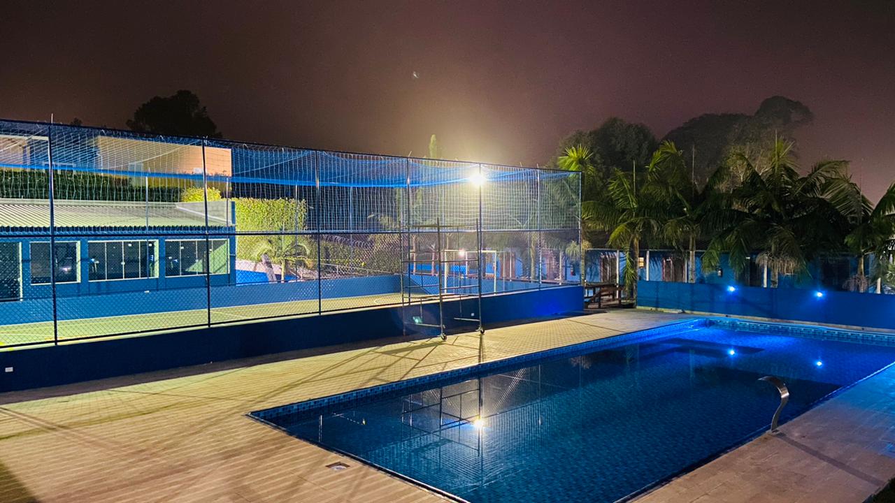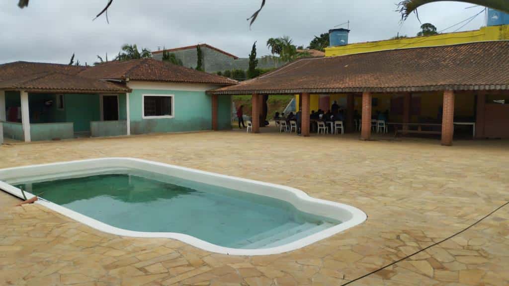 Ambientes equipados com piscina, academia, campo e quadra para esportes, refeitório, além de uma área ampla.